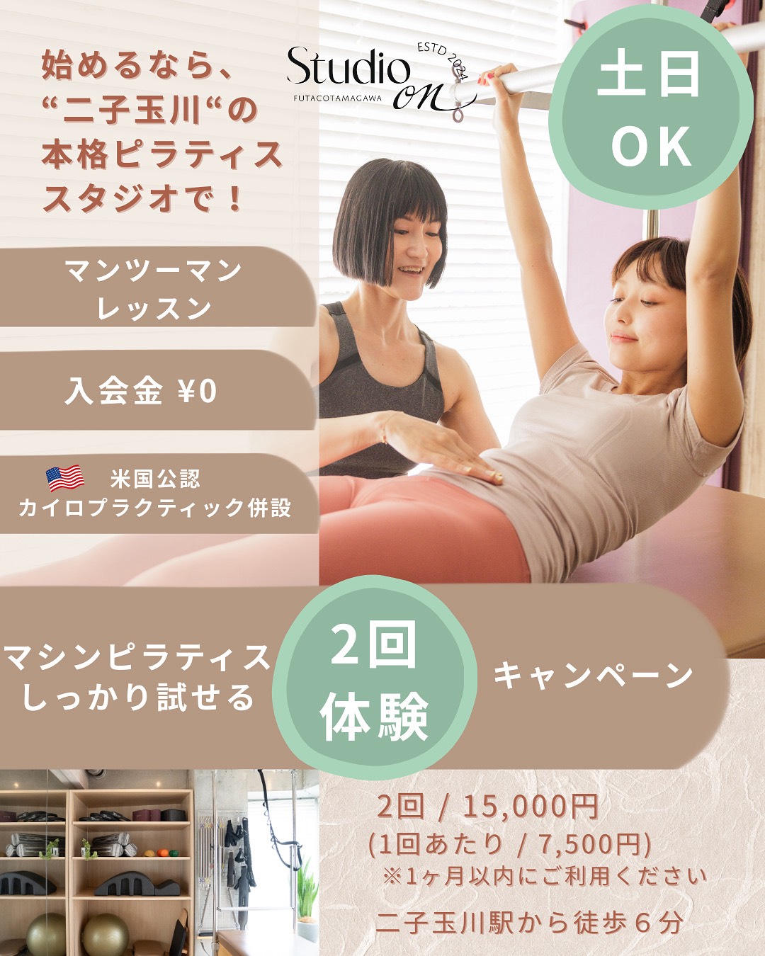 2015年からこの地でピラティススタジオを始め、2024年10月にリニューアル、スタジオ名を「Studio On」として新たなスタートを切りました。これからも水と緑、深呼吸ができる街、二子玉川で、皆様の可能性を最大限に引き出すお手伝いをいたします。ピラティス、ヤムナフットフィットネス®︎、コアフェイストレーニング®︎、カイロプラクティックを通して、身体のトータルケアをご提供いたします。
